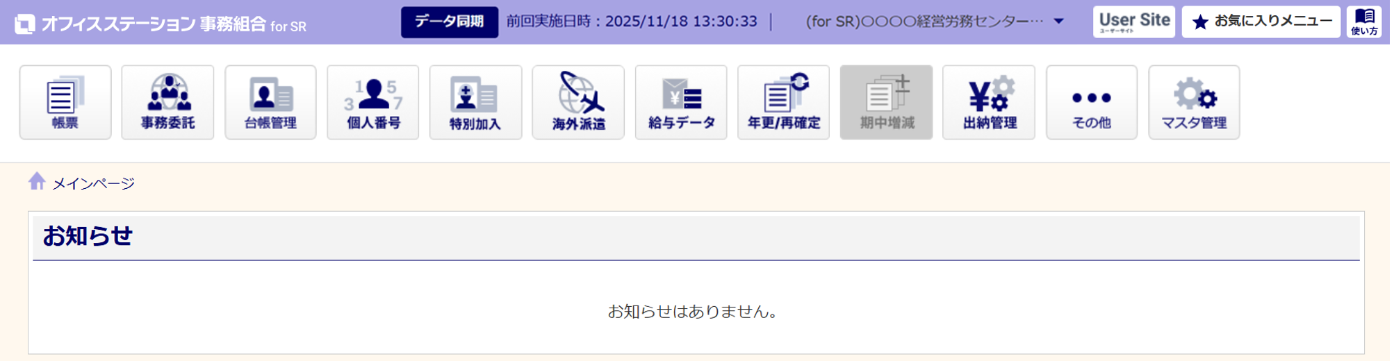 「オフィスステーション 事務組合 for SR」のシステム画面へ切り替わります。
