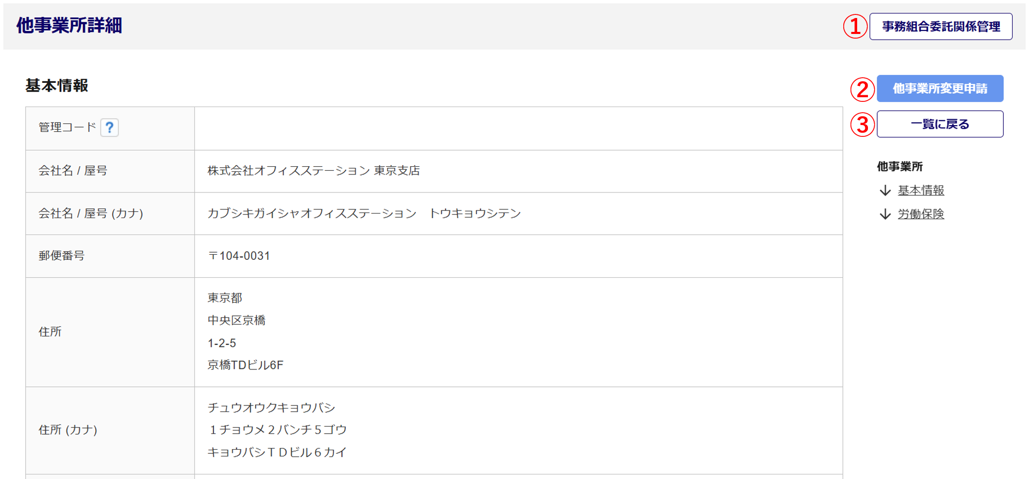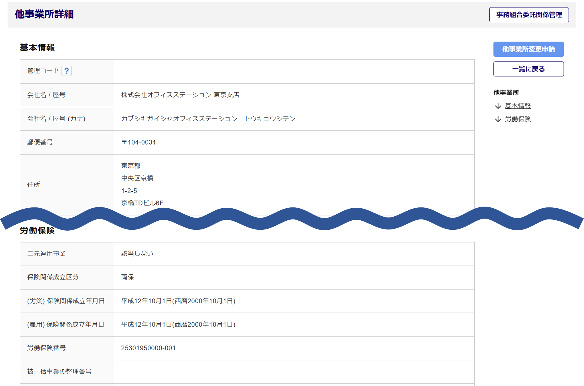 事務組合委託関係管理 他事業所に登録されている労働保険番号に対して、事務組合との委託情報を確認します。