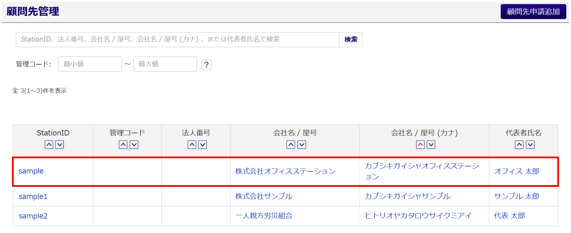 顧問先一覧から、他事業所情報を確認する顧問先をクリックします。