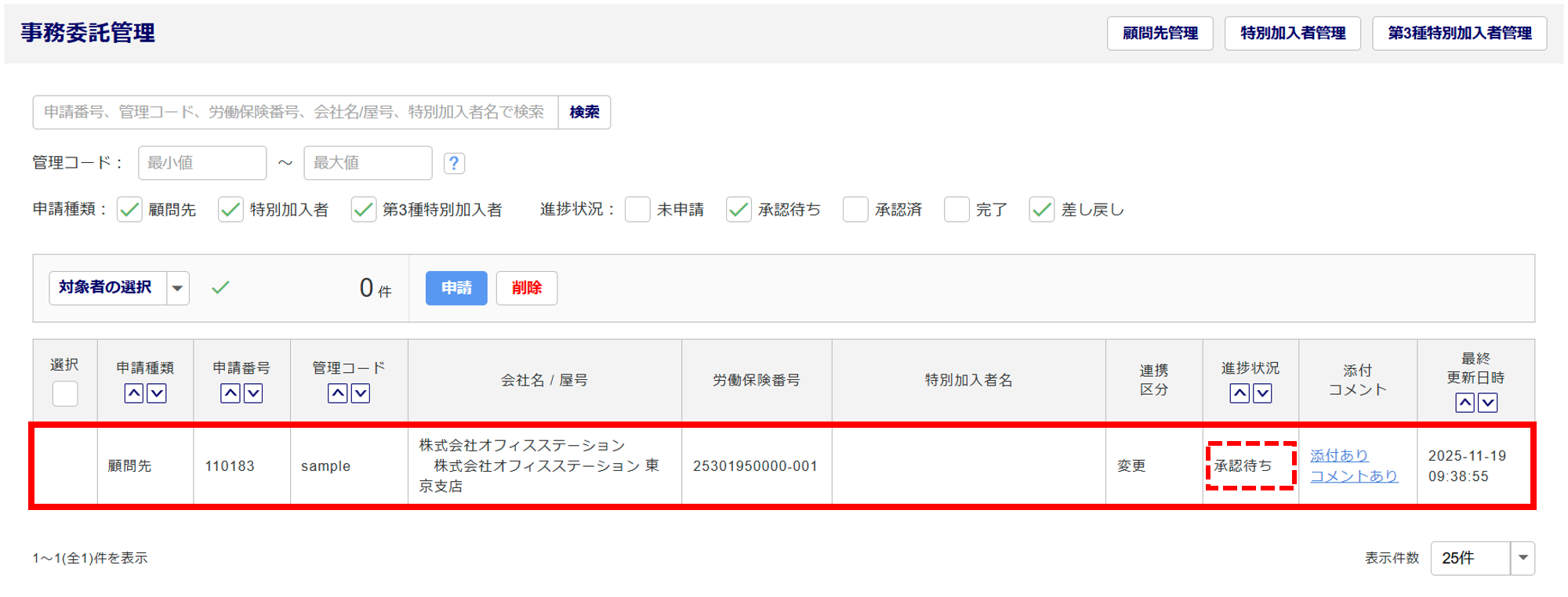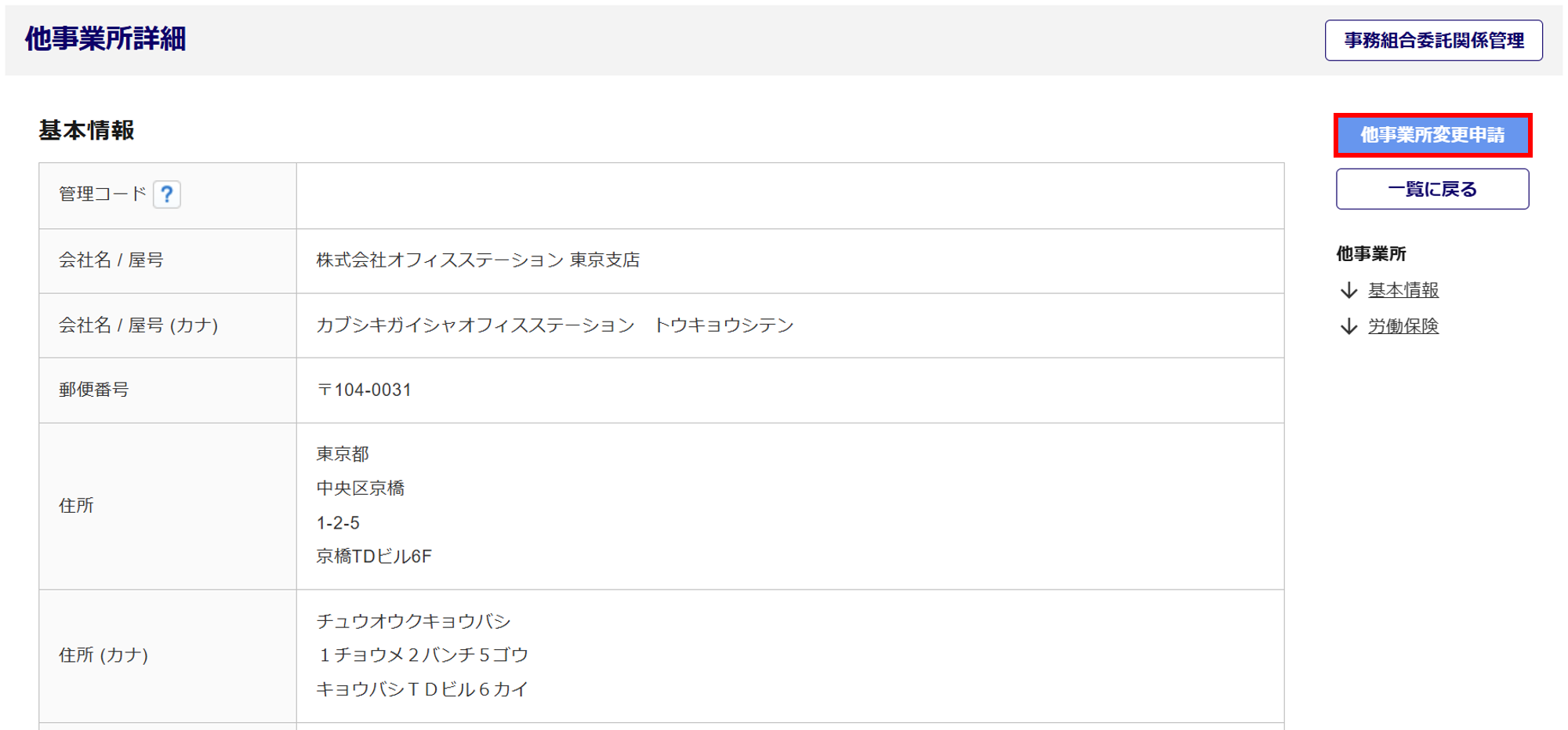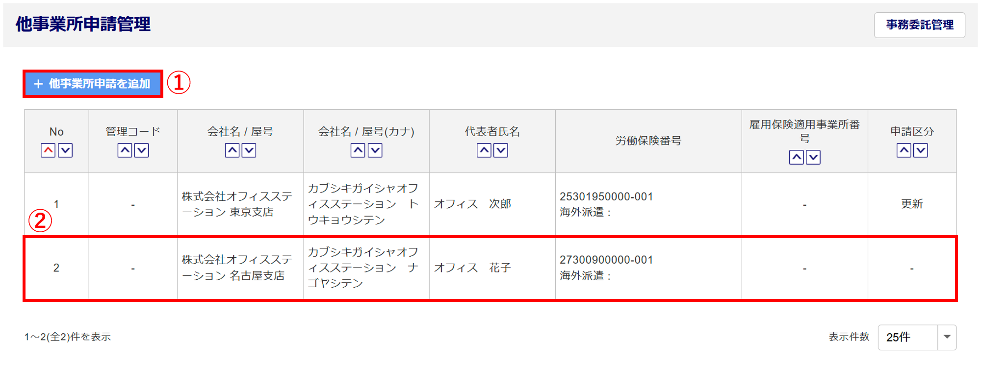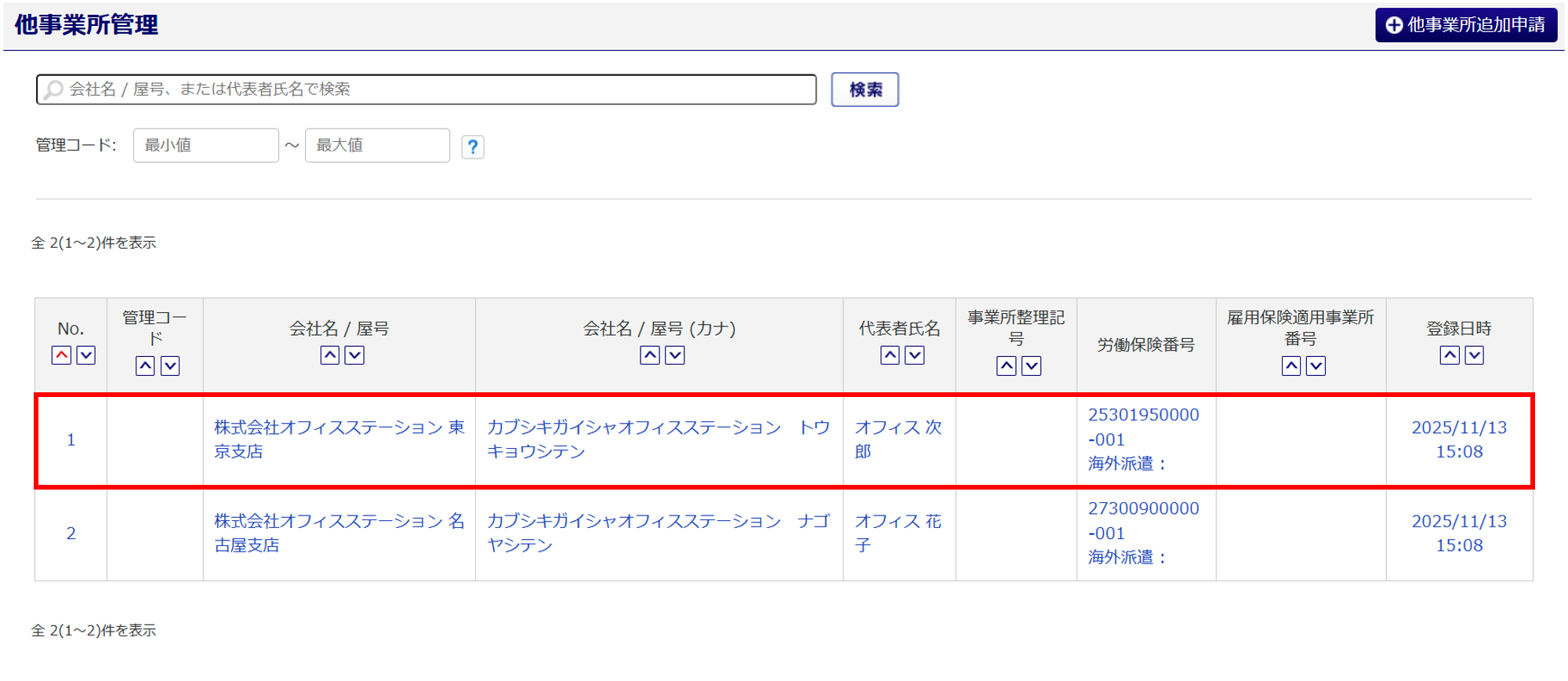 変更情報が保存され、「他事業所申請管理」画面に、保存した他事業所が表示されます。