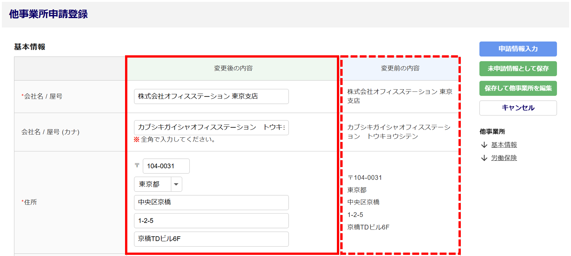 「変更前の内容」列(赤破線枠部分)には、現在登録されている情報が表示されます。