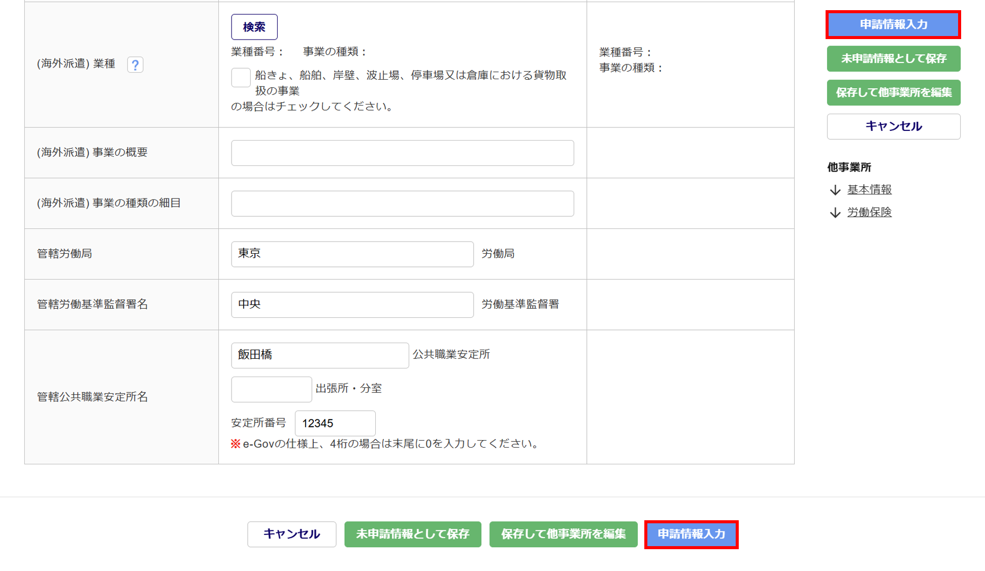 | 管轄労働局 | 入力しておくことで、オフィスステーションで電子申請をする際に、都度設定する必要がなくなります。 |
