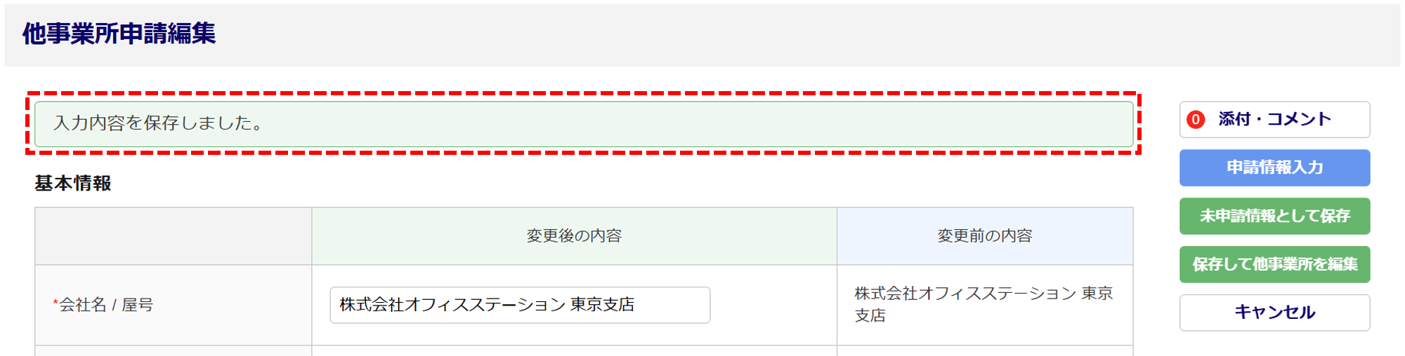画面上部に「入力内容を保存しました。」と表示されたら、変更情報の保存は完了です。