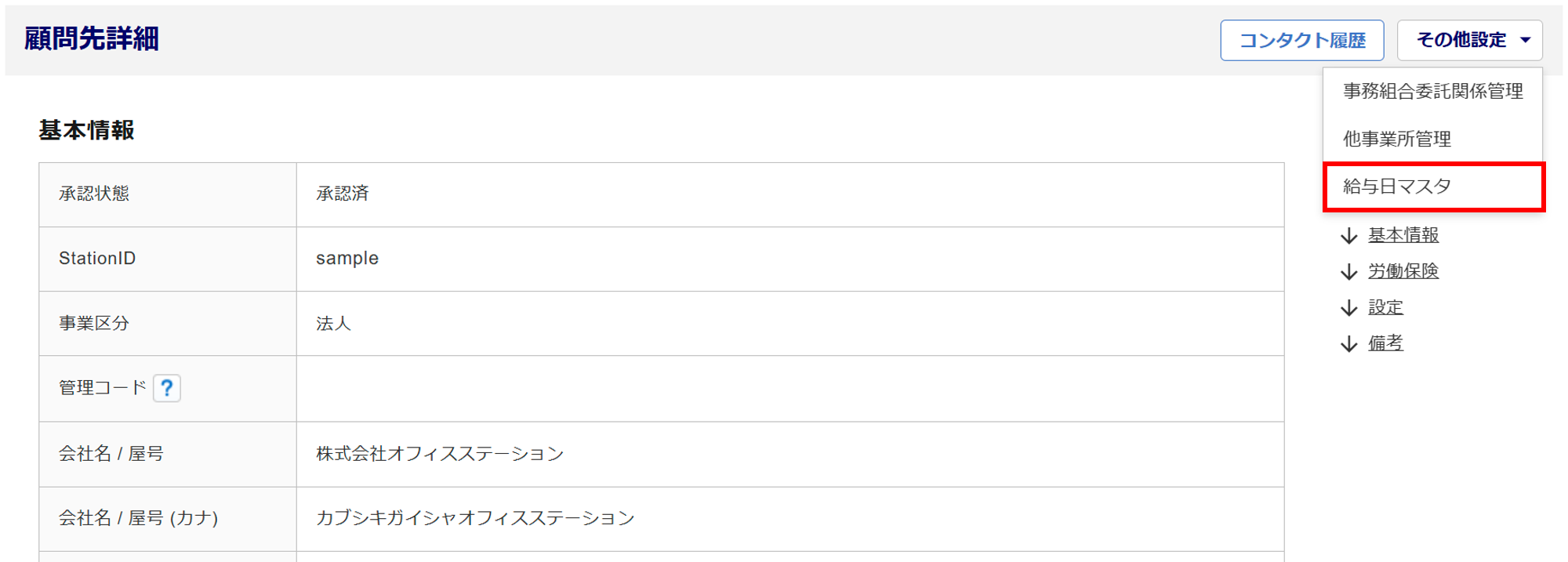 画面上部の[その他設定]をクリックし、表示されるメニュー内の[給与日マスタ]をクリックします。
