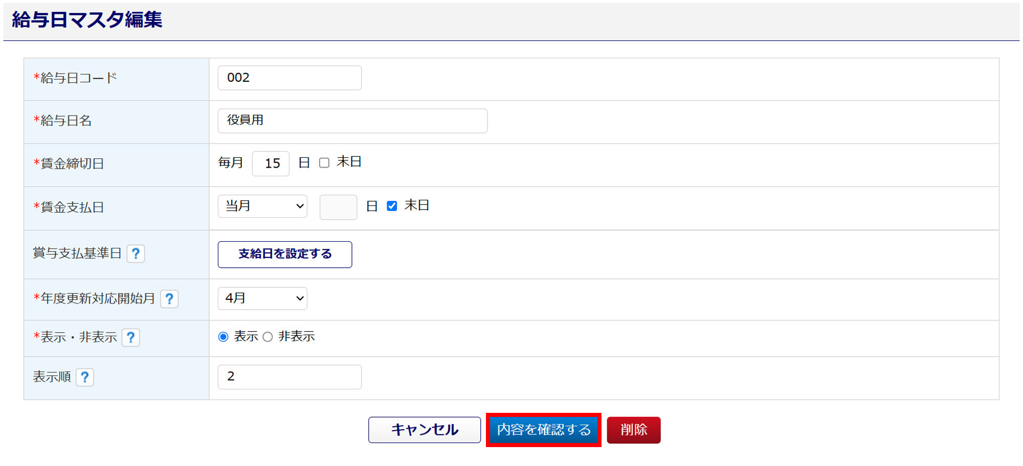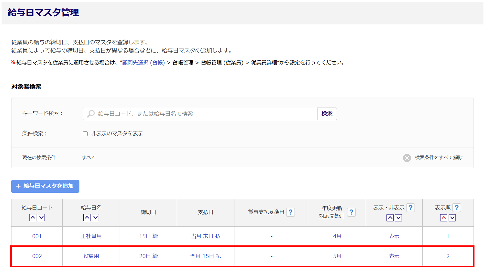 給与日マスタ登録時、「表示・非表示」項目に「非表示」を設定した場合、「給与日マスタ管理」画面に登録した給与日マスタ情報が表示されません。