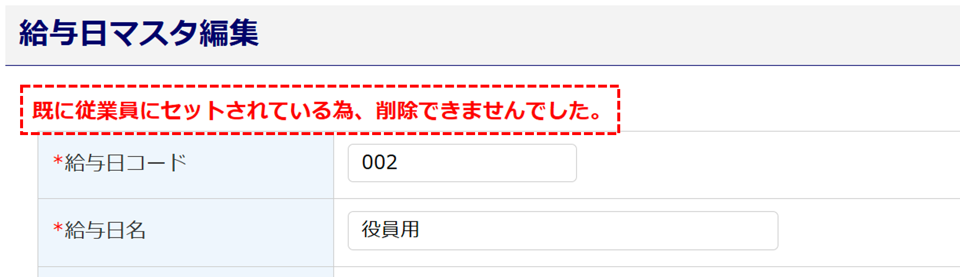 該当の給与日マスタ情報を従業員に適用している場合、[削除]ボタンをクリックすると画面上部に「既に従業員にセットされている為、削除できませんでした。」とエラー表示されます。