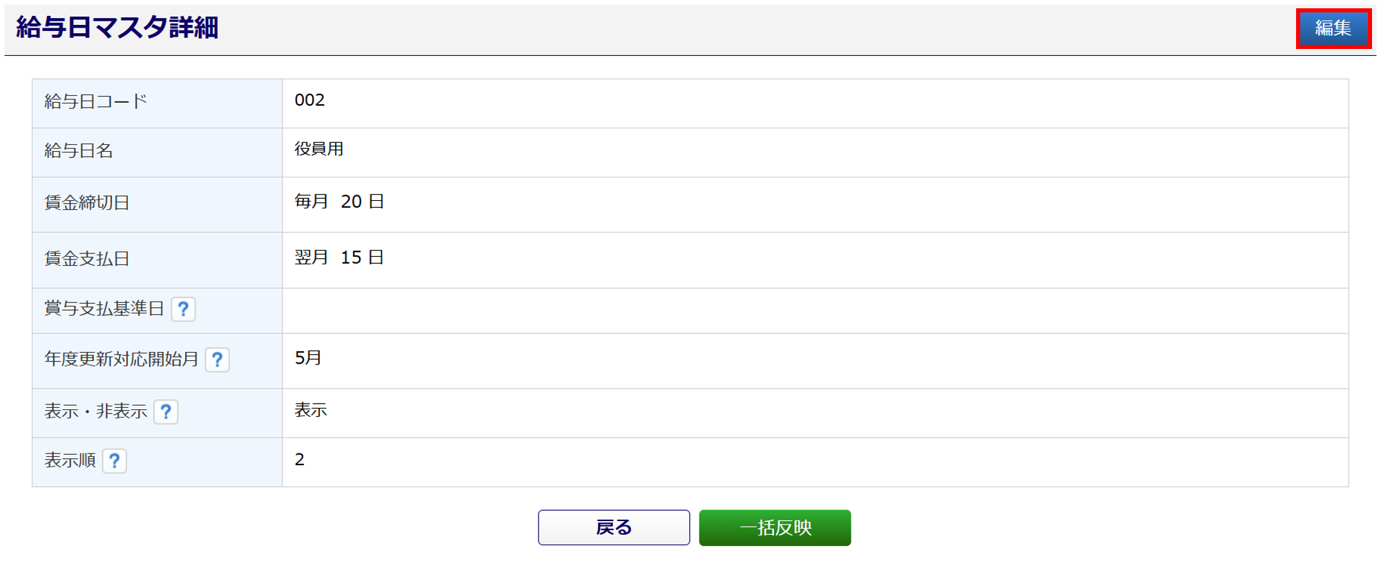 「給与日マスタ詳細」画面が表示されますので、画面右上の[編集]をクリックします。