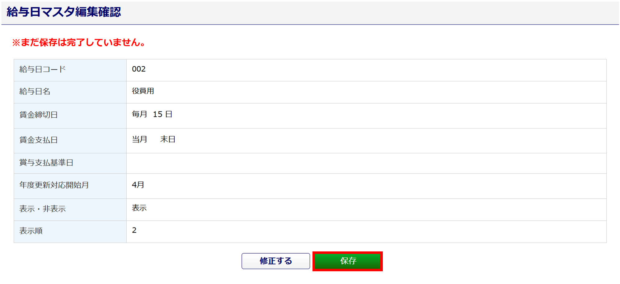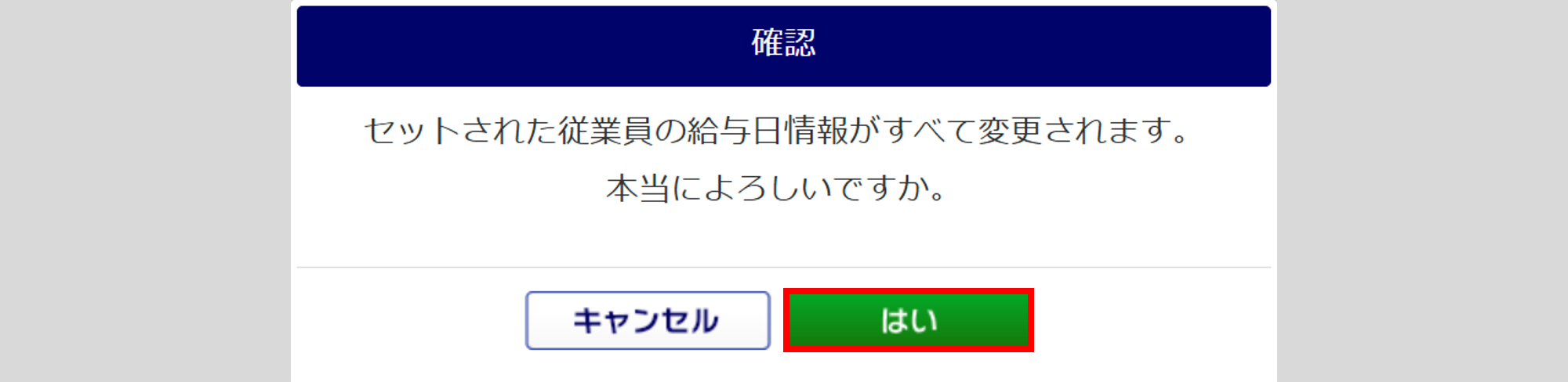 従業員に適用している給与日マスタ情報を編集した場合、「確認」画面が表示されます。