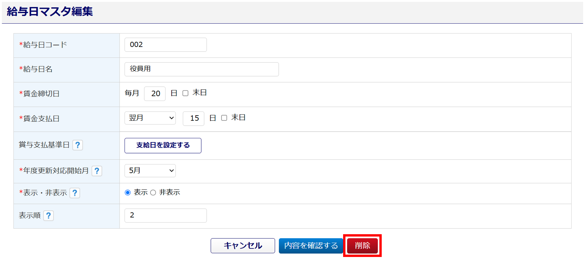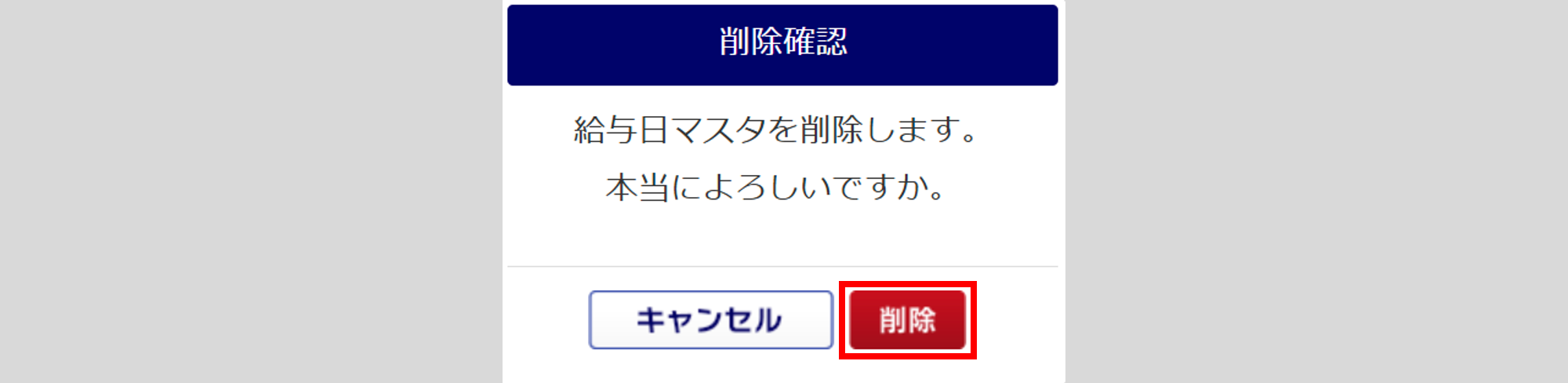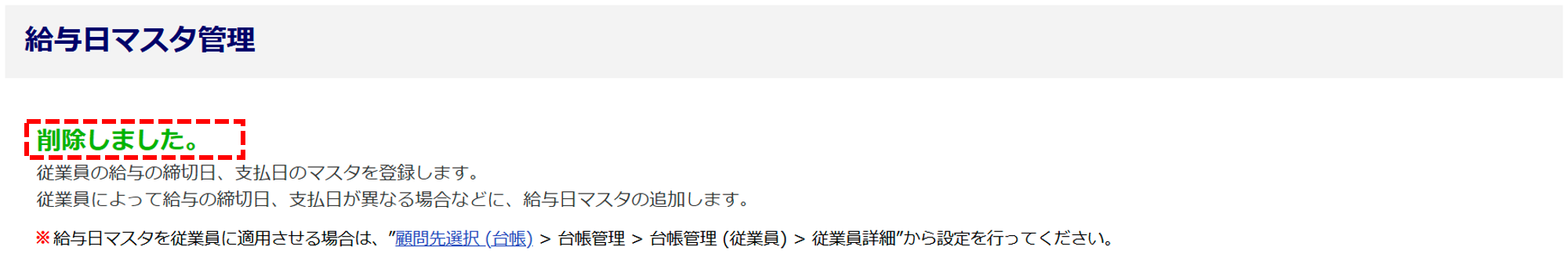 画面上部に「削除しました。」と表示されたら、給与日マスタ情報の削除は完了です。