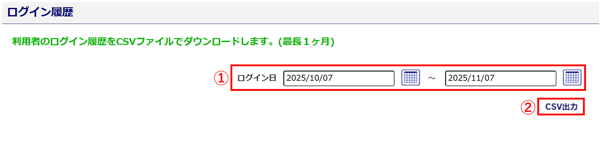確認したい「ログイン日」(①)を設定し、[CSV出力](②)をクリックします。
