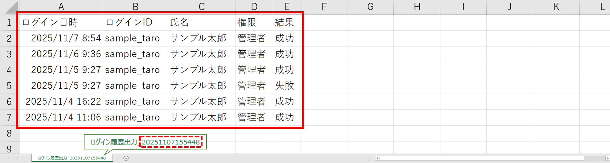 ファイル名は、「ログイン履歴出力_yyyymmddhhmmss.csv」*で出力します。