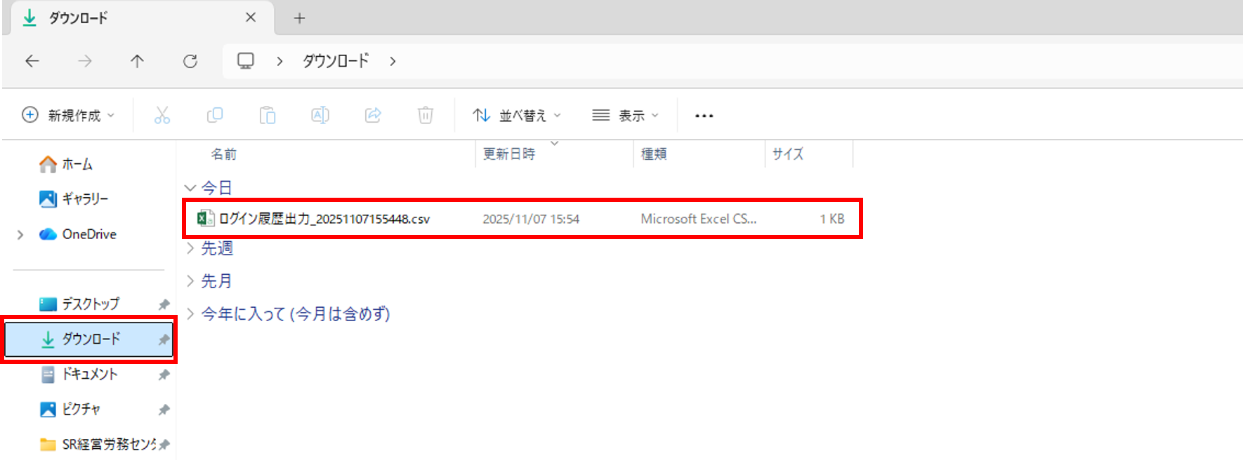 ダウンロード後、保存したフォルダから、CSVファイルをクリックしてファイルを開きます。