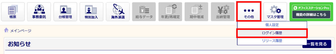 [その他]をクリックし、表示されるメニュー内の[ログイン履歴]をクリックします。