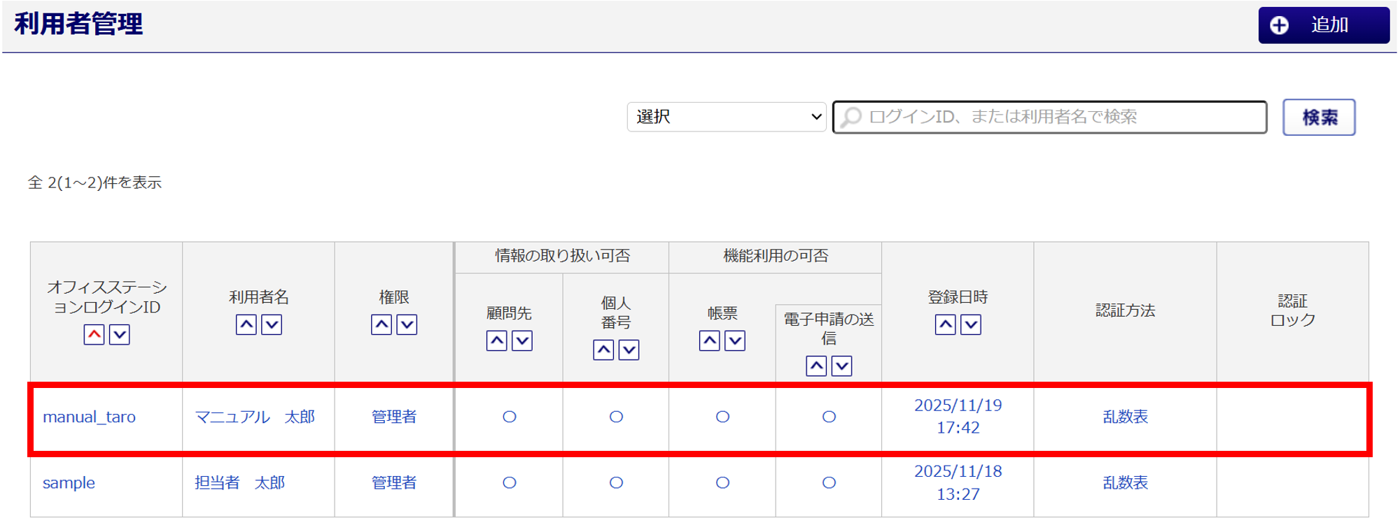 なお、ログインしている担当者本人の利用者アカウント情報を削除することはできません。