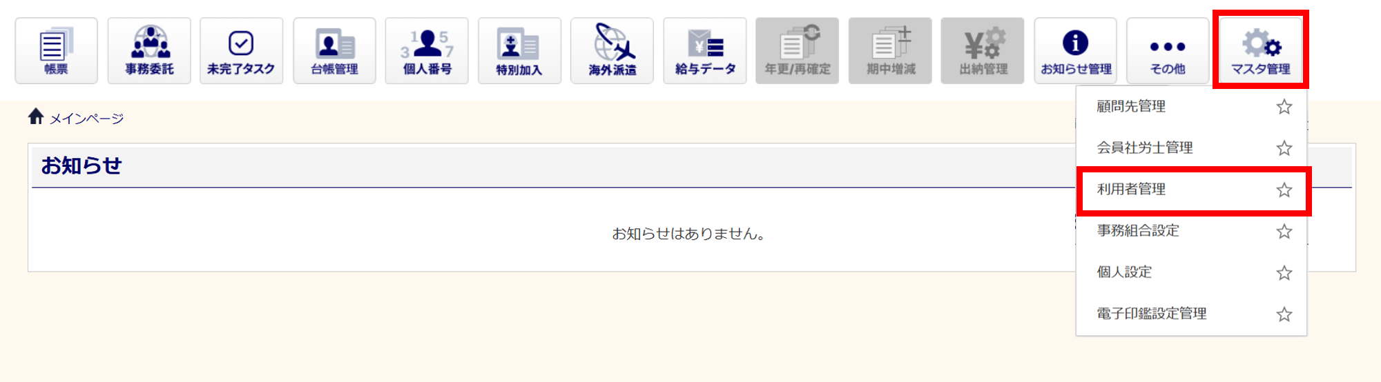 [マスタ管理]>[利用者管理]をクリックします。