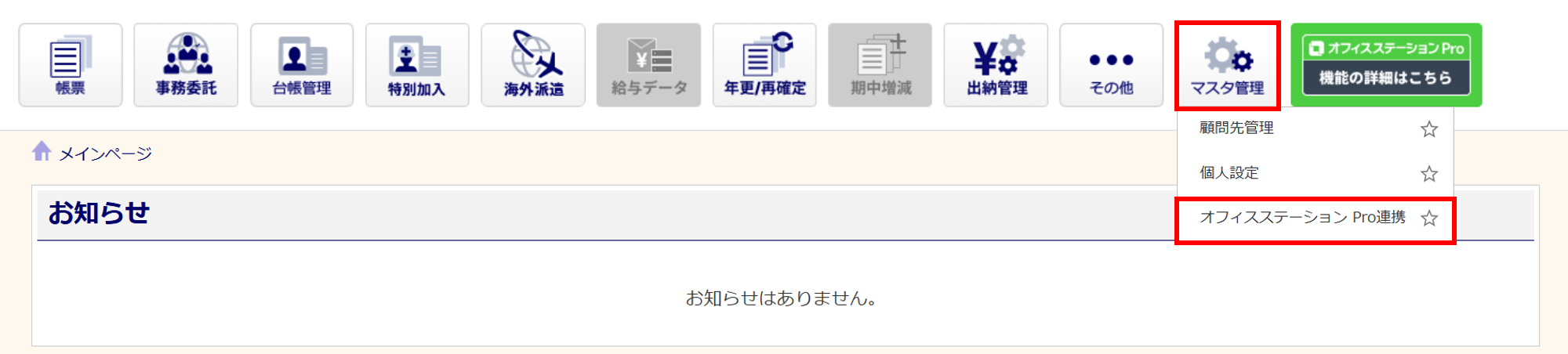 [マスタ管理]をクリックし、表示されるメニュー内の[オフィスステーション Pro連携]をクリックします。