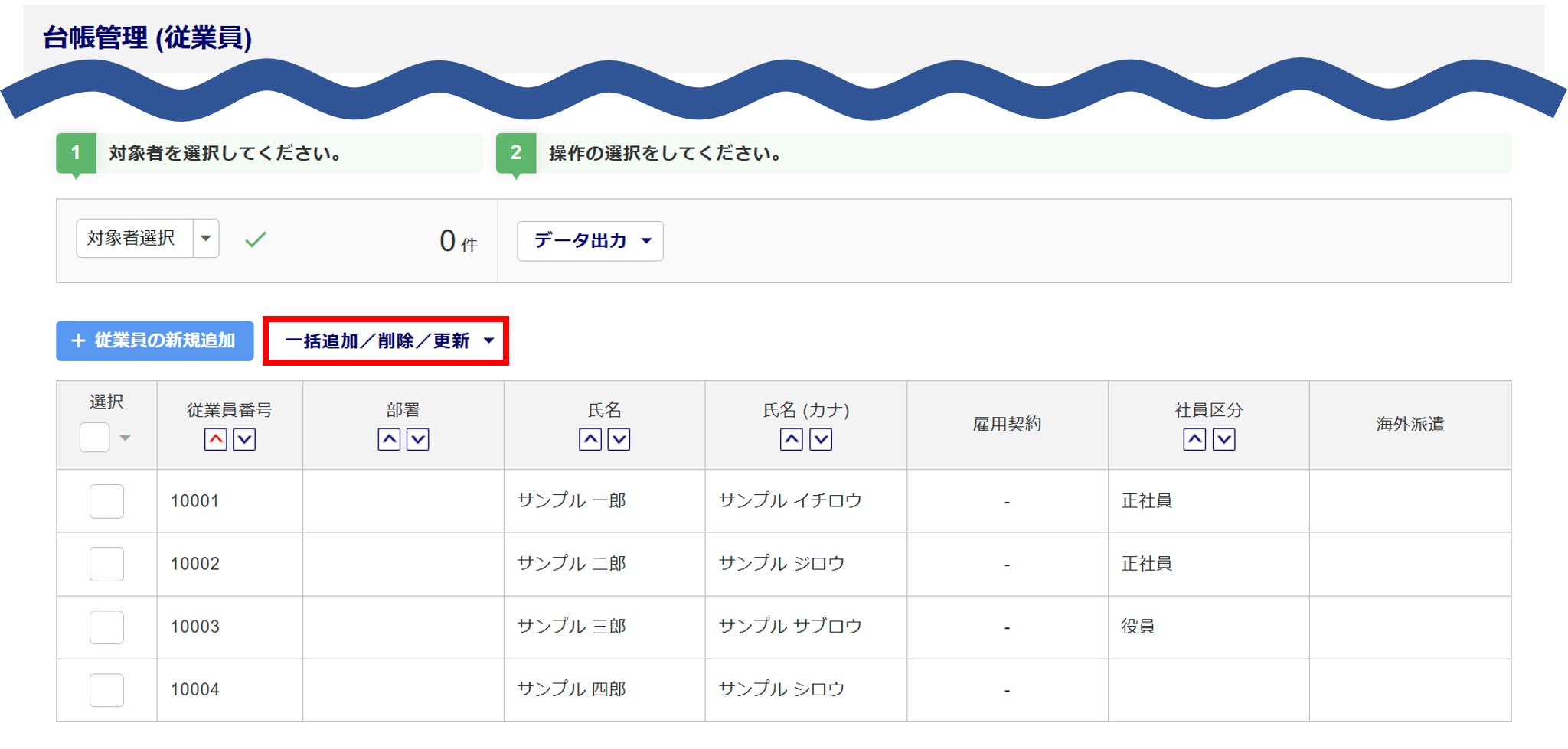 「オフィスステーション 事務組合 for SR」システムでも、「台帳管理 (従業員)」画面の[一括追加/削除/更新]から、従業員情報の一括登録および編集ができます。