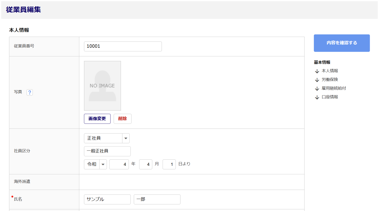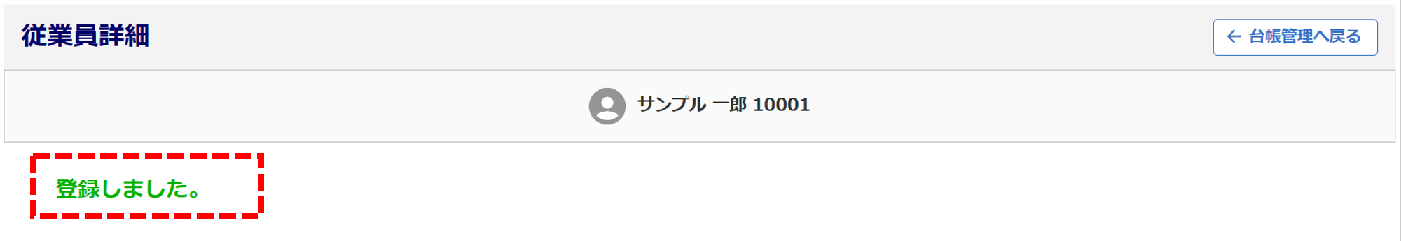 「従業員詳細」画面上部に「登録しました。」と表示されたら、登録は完了です。