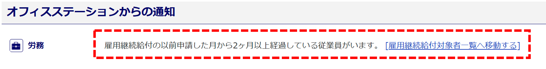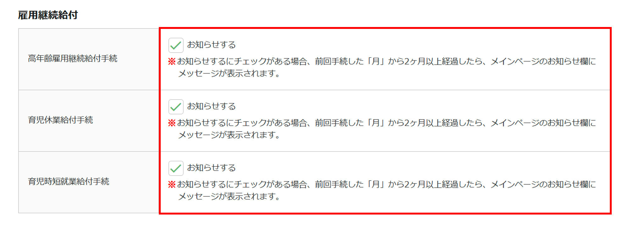 「高年齢雇用継続給付手続」「育児休業給付手続」「育児時短就業給付手続」の「お知らせする」にチェックがある場合、前回手続きした「月」から2カ月以上経過すると、メインページのお知らせ欄に以下のメッセージが表示されます。