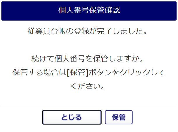 従業員を新規追加した際に、「個人番号保管確認」画面が表示されます。