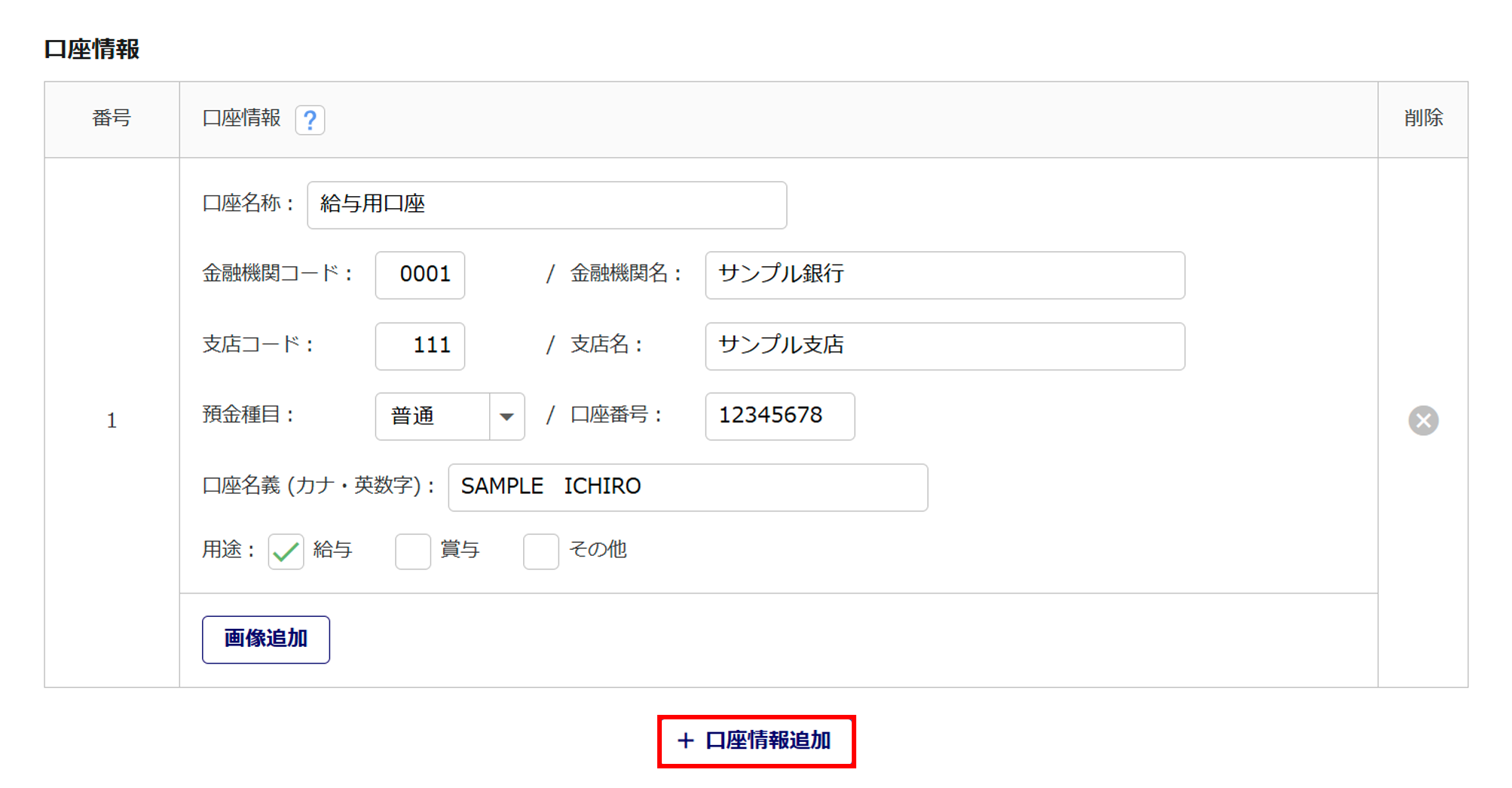口座情報を複数登録する場合は、[口座情報追加]をクリックすると、入力欄が追加されます。