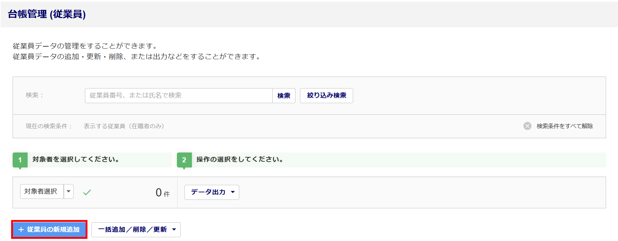 「台帳管理 (従業員)」画面が表示されますので、[従業員の新規追加]をクリックします。