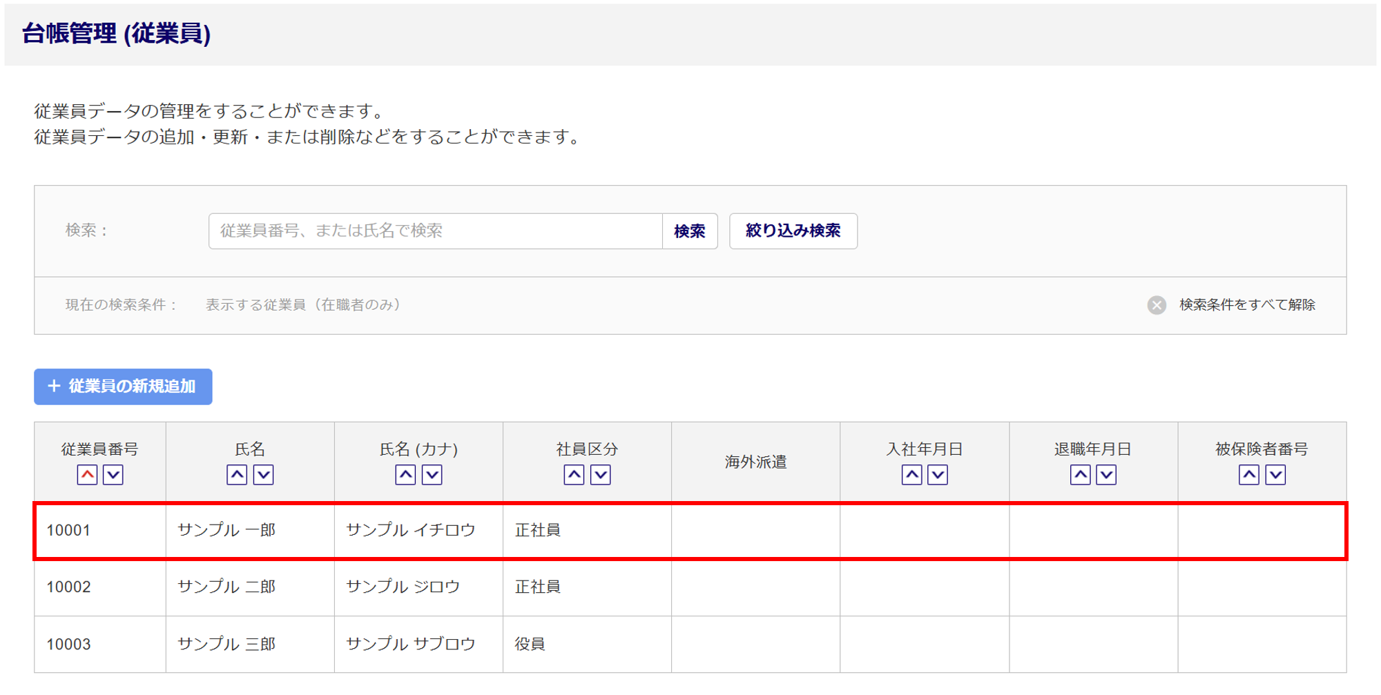 従業員情報を編集、または削除する対象の従業員をクリックします。