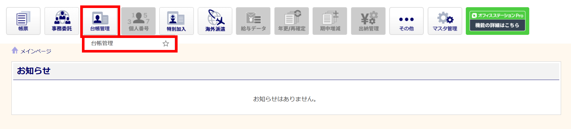 「台帳管理 (従業員)」画面上部に「削除しました。」と表示されたら、従業員情報の削除は完了です。