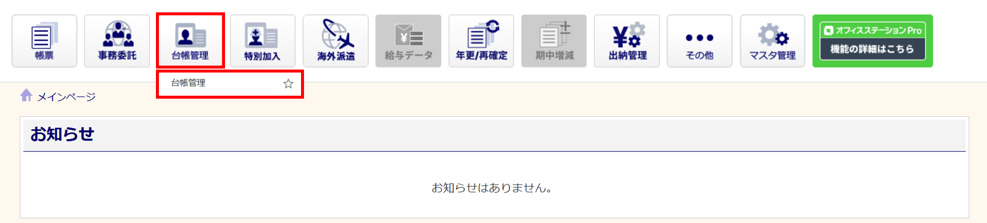 [台帳管理]をクリックし、表示されるメニュー内の[台帳管理]をクリックします。