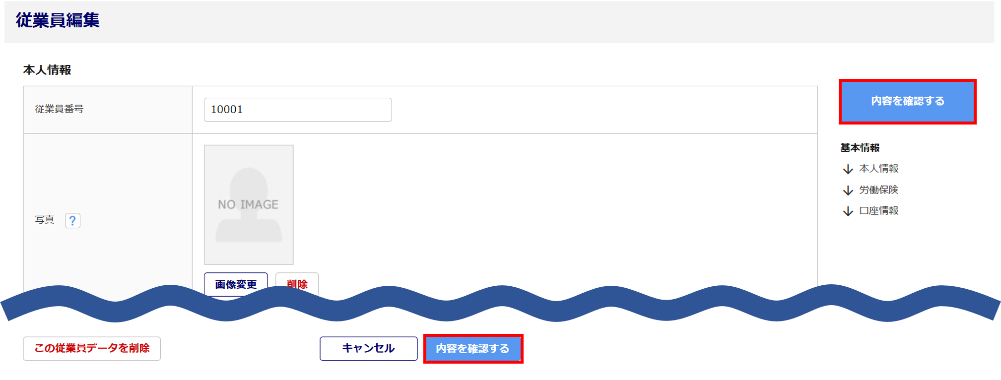 「従業員削除確認」画面が表示されます。内容を確認し、[削除]をクリックします。