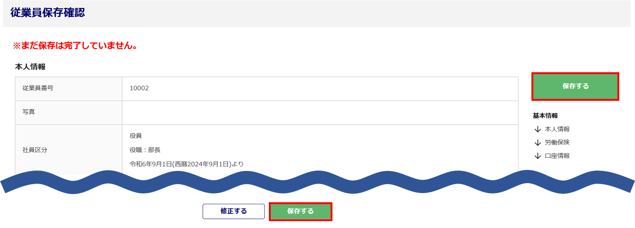内容を確認し、問題がなければ、画面最下部または画面右側の[保存する]をクリックします。