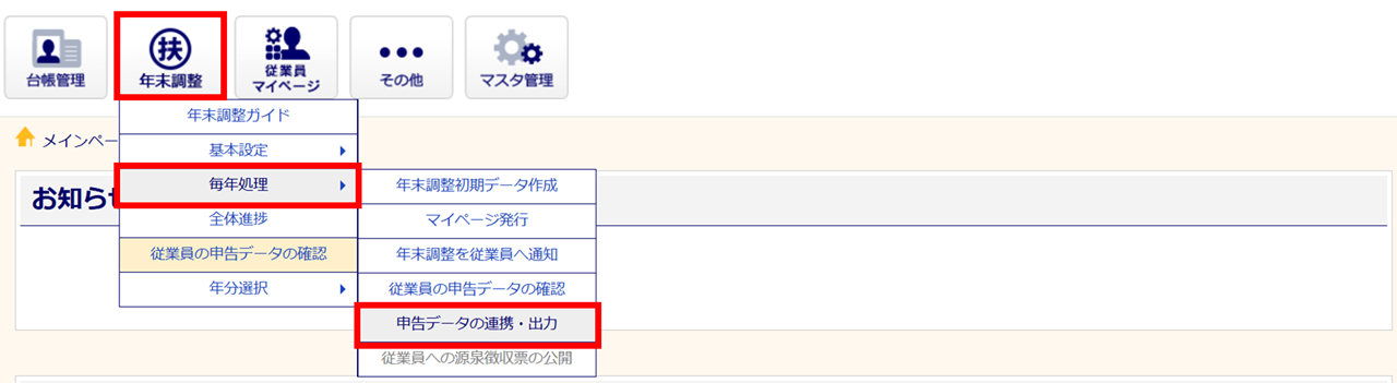 [年末調整]>[毎年処理]>[申告データの連携・出力]をクリックします。