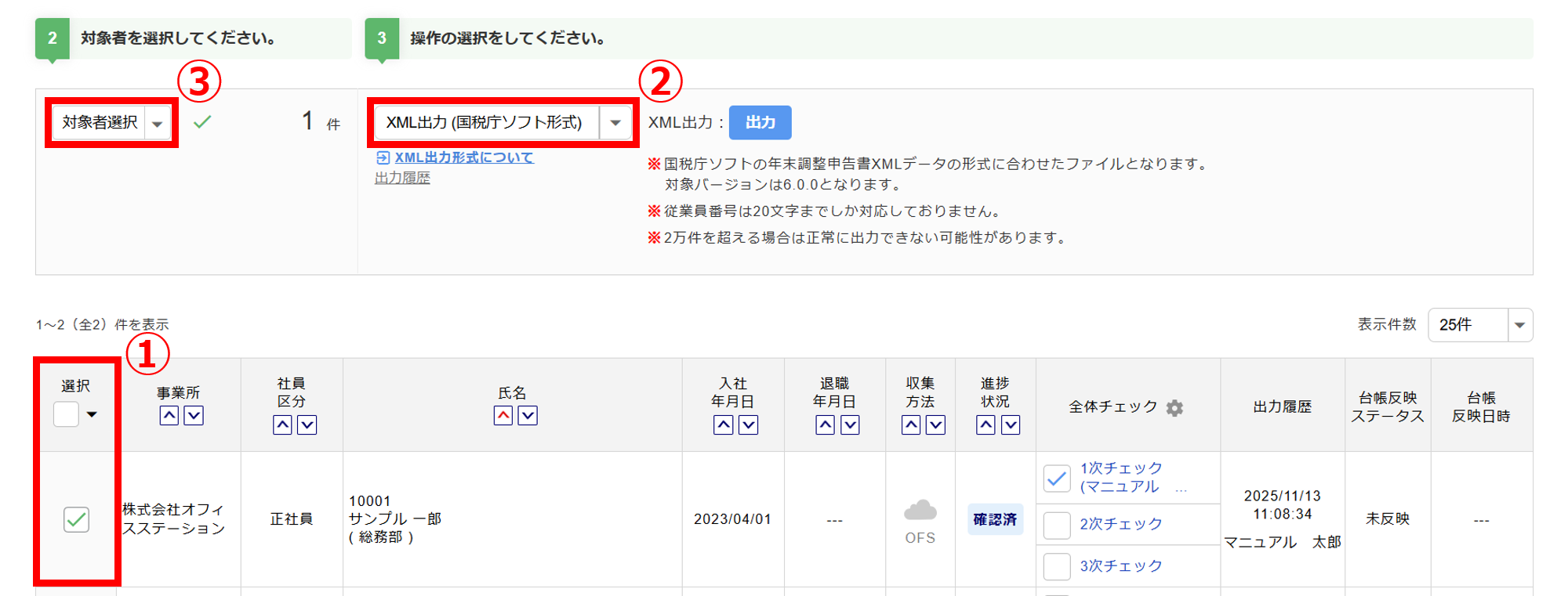 操作の選択(②)にて「XML出力(国税庁ソフト形式)」を選択します。
