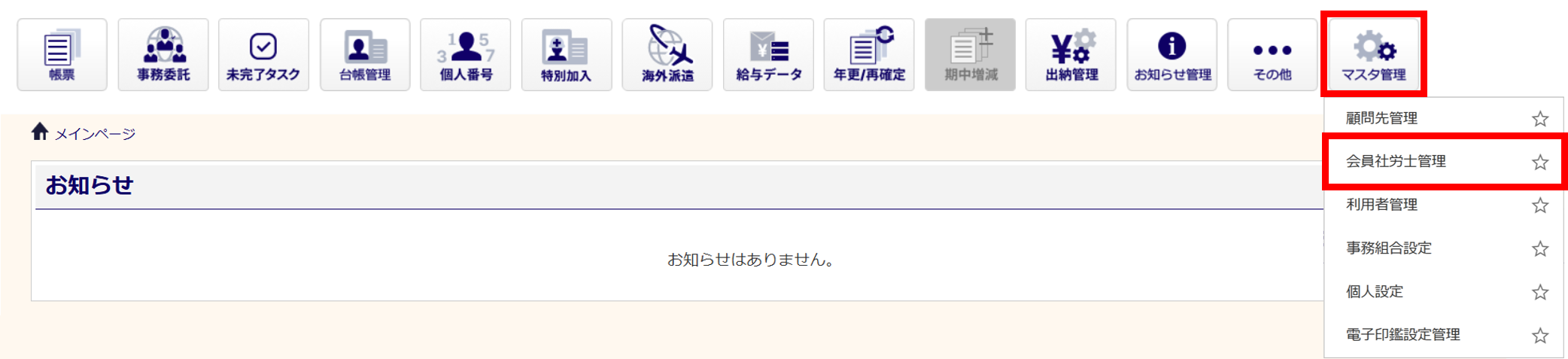 [マスタ管理]>[会員社労士管理]をクリックします。