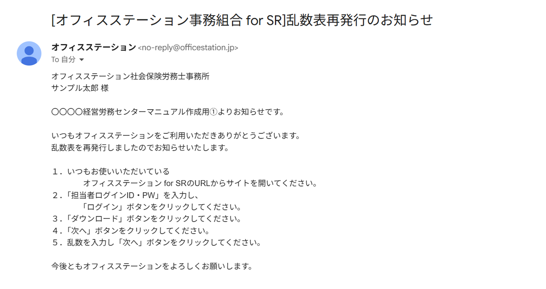 事務局へ依頼すると、事務局側から登録しているメールアドレス宛に、「[オフィスステーション 事務組合 for SR]乱数表再発行のお知らせ」メールが通知されます。
