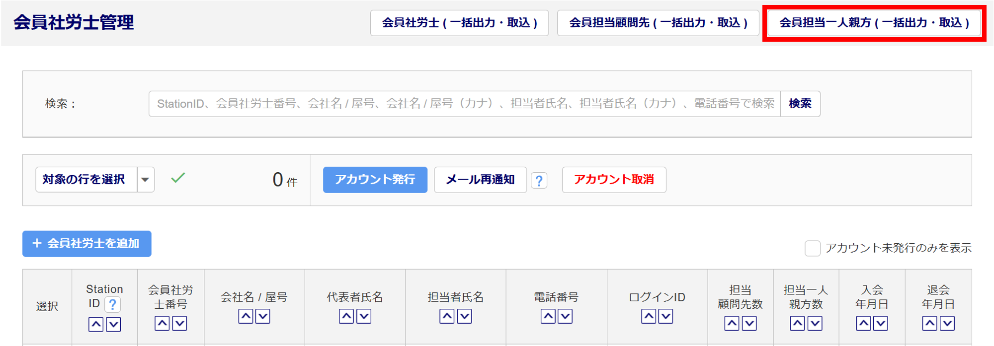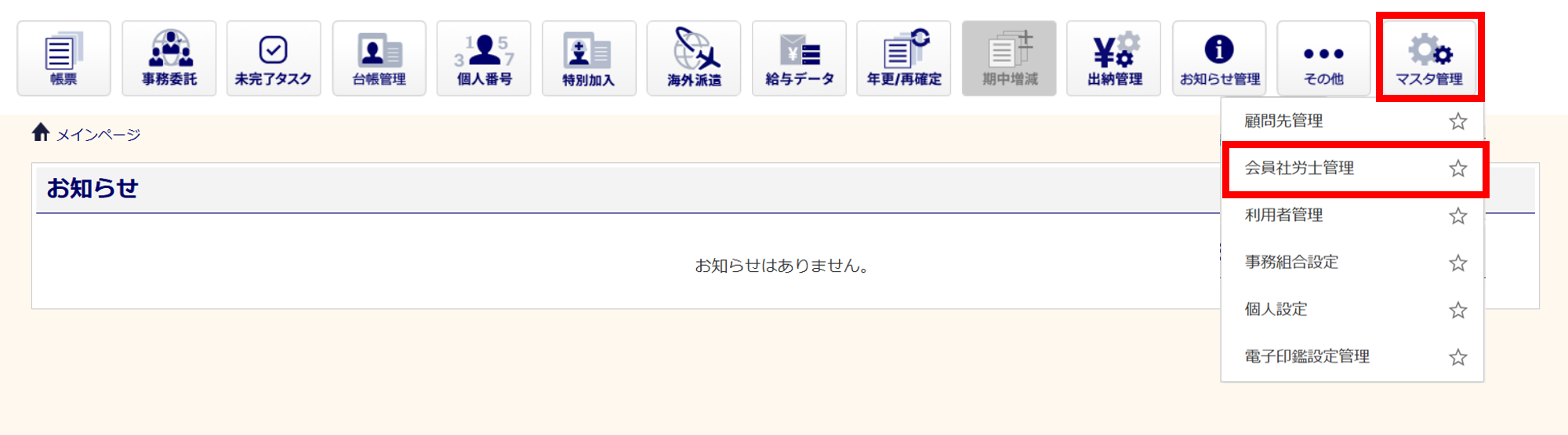 [マスタ管理]>[会員社労士管理]をクリックします。