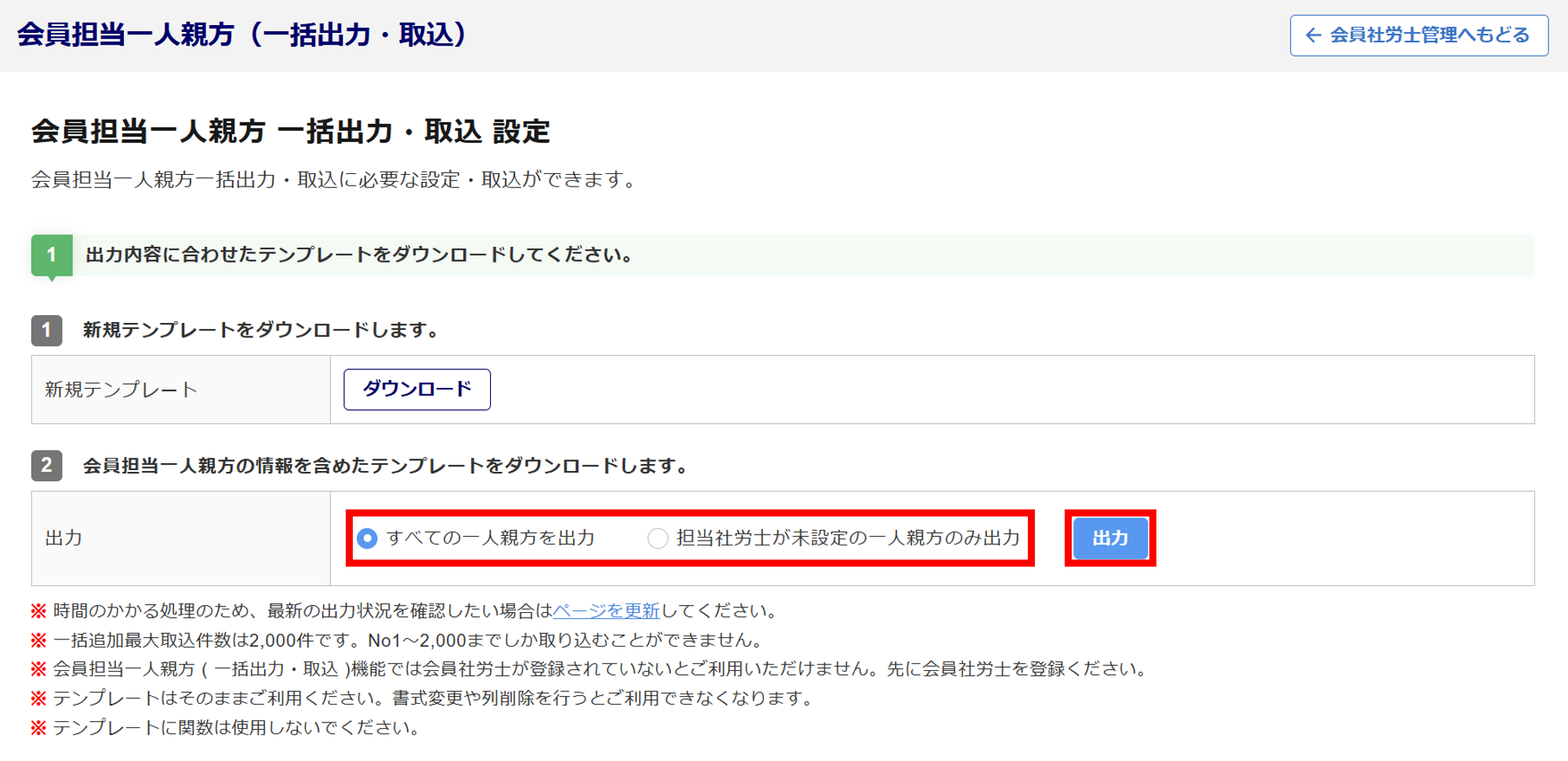「すべての一人親方を出力」もしくは、「担当社労士が未設定の一人親方のみ出力」を選択、[出力]をクリックします。