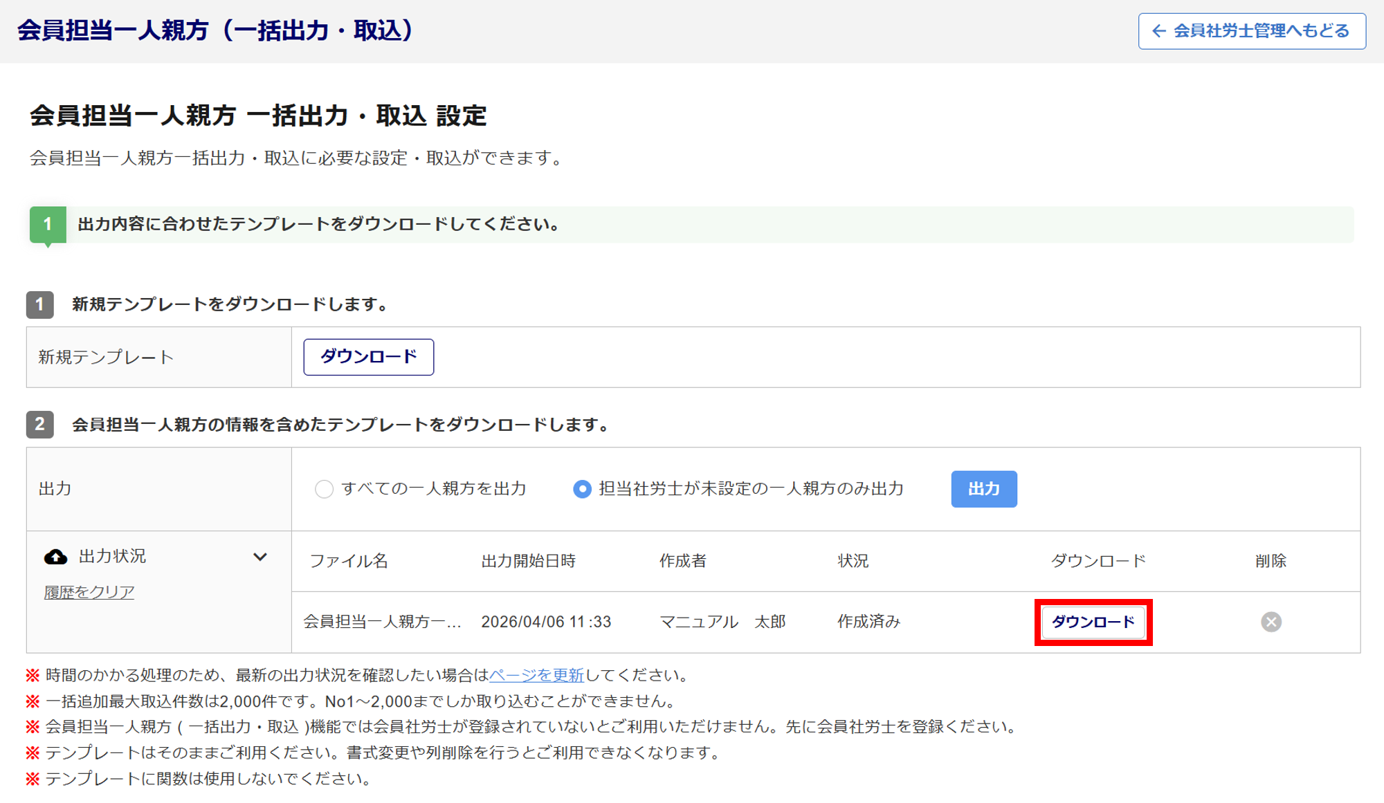 会員担当顧問先出力/取込用テンプレートの出力