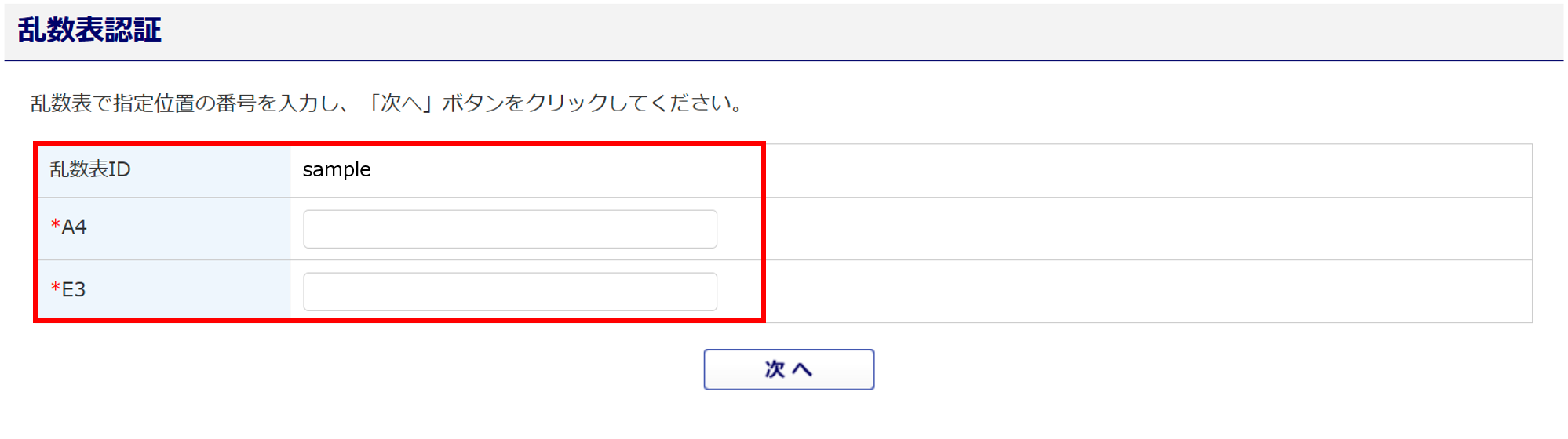 利用者のログイン画面で[ログイン]ボタンをクリックした後に、表示される「乱数表認証」画面で使用します。