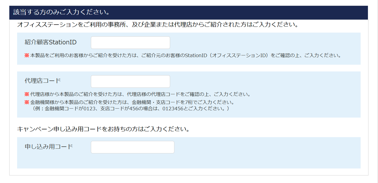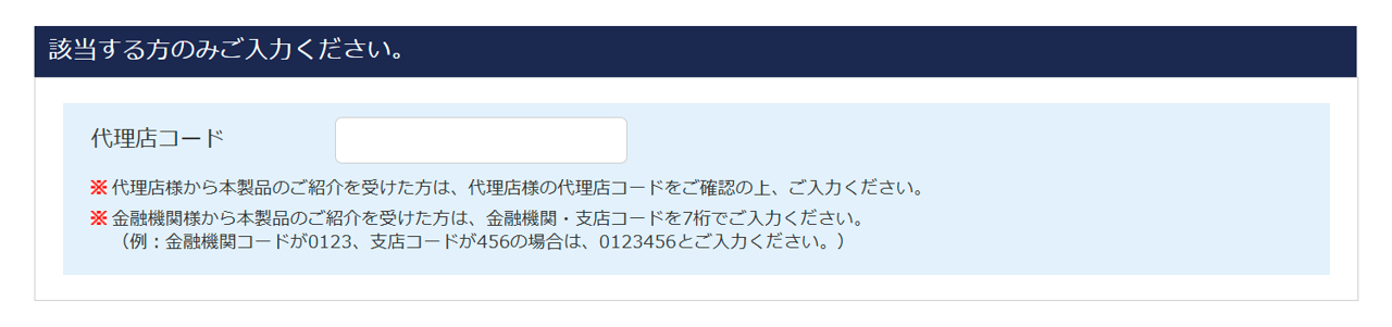 代理店または金融機関から紹介を受けた場合は、「代理店コード」を入力します。