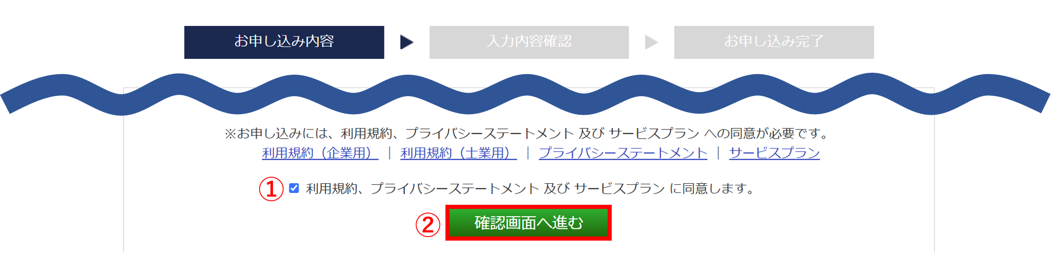 お申し込み内容を入力および、選択後、「利用規約、プライバシーステートメント 及び サービスプラン に同意します。」()にチェックを入れ、[確認画面へ進む]()クリックします。
