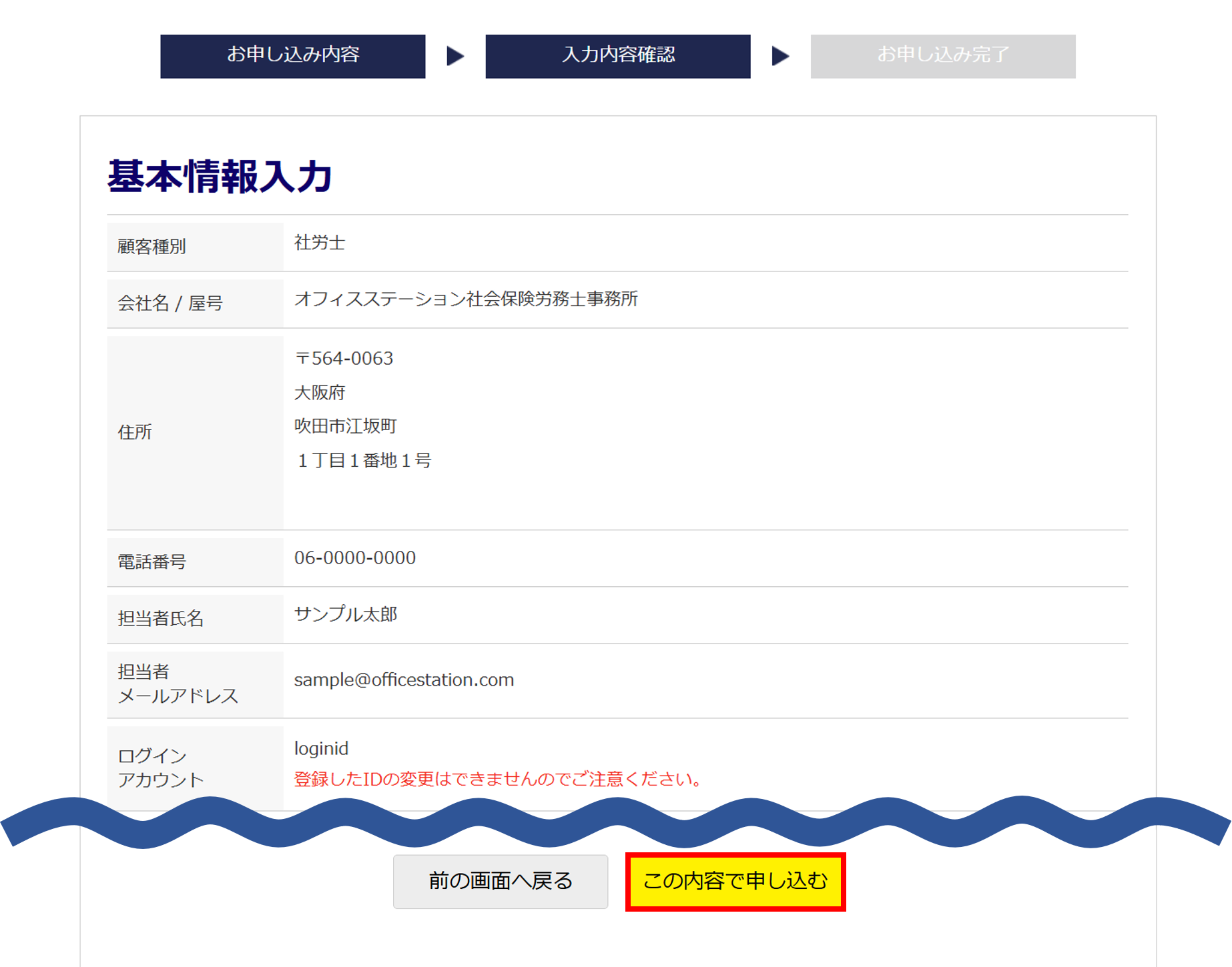 「お申し込み内容」画面で入力した情報に問題がなければ、[この内容で申し込む]をクリックします。