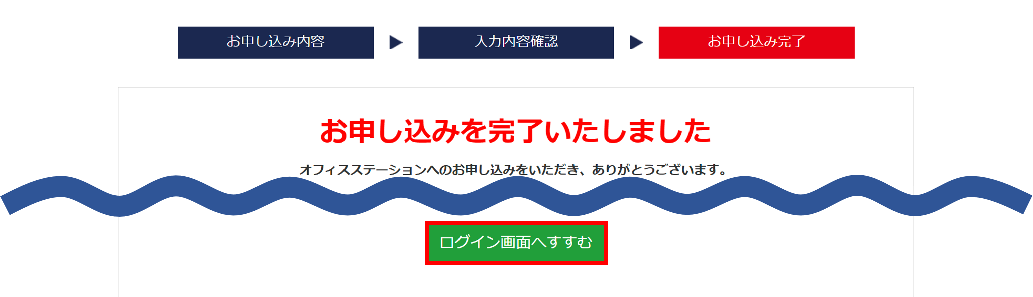「お申し込み完了」画面へ切り替わり、画面に「お申し込みを完了いたしました」と表示されたら、「オフィスステーション Pro」の契約お申し込みは完了です。