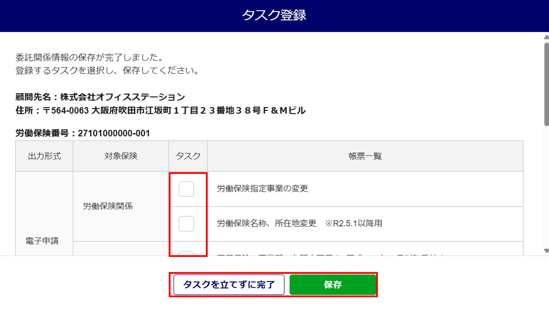 タスクとして登録する場合、「タスク」列にチェックし、[保存]をクリックします。