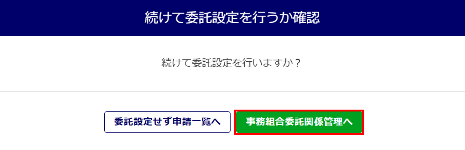 新規の顧問先登録申請の場合、「続けて委託設定を行うか確認」画面が表示されます。