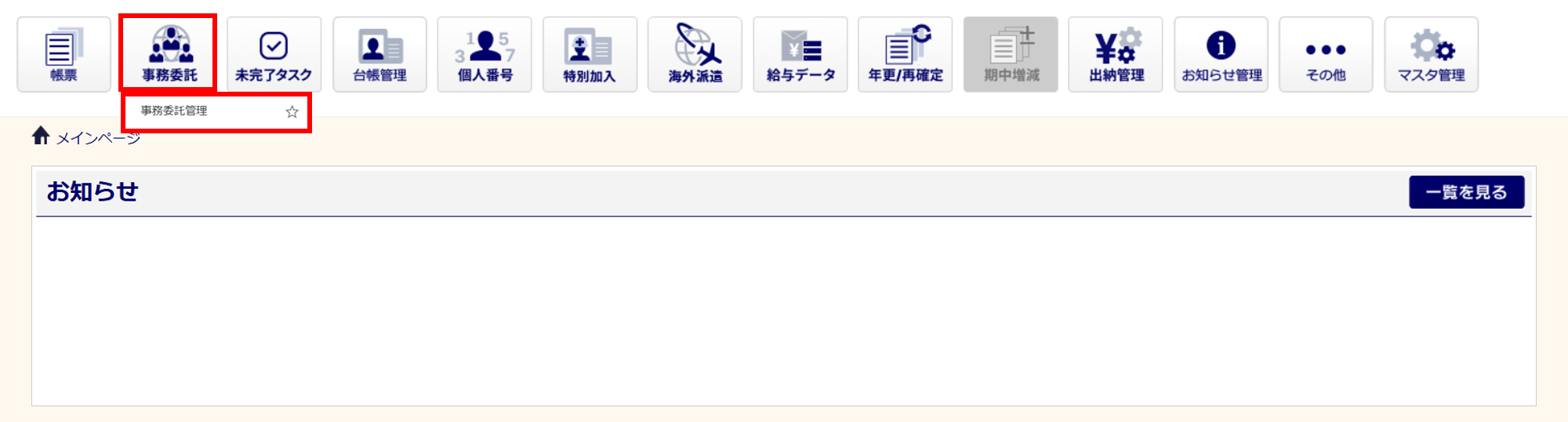 [事務委託]>[事務委託管理]をクリックします。