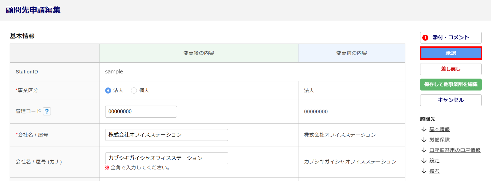 変更の申請の場合、下図のように「変更後の内容」「変更前の内容」が表示されます。
