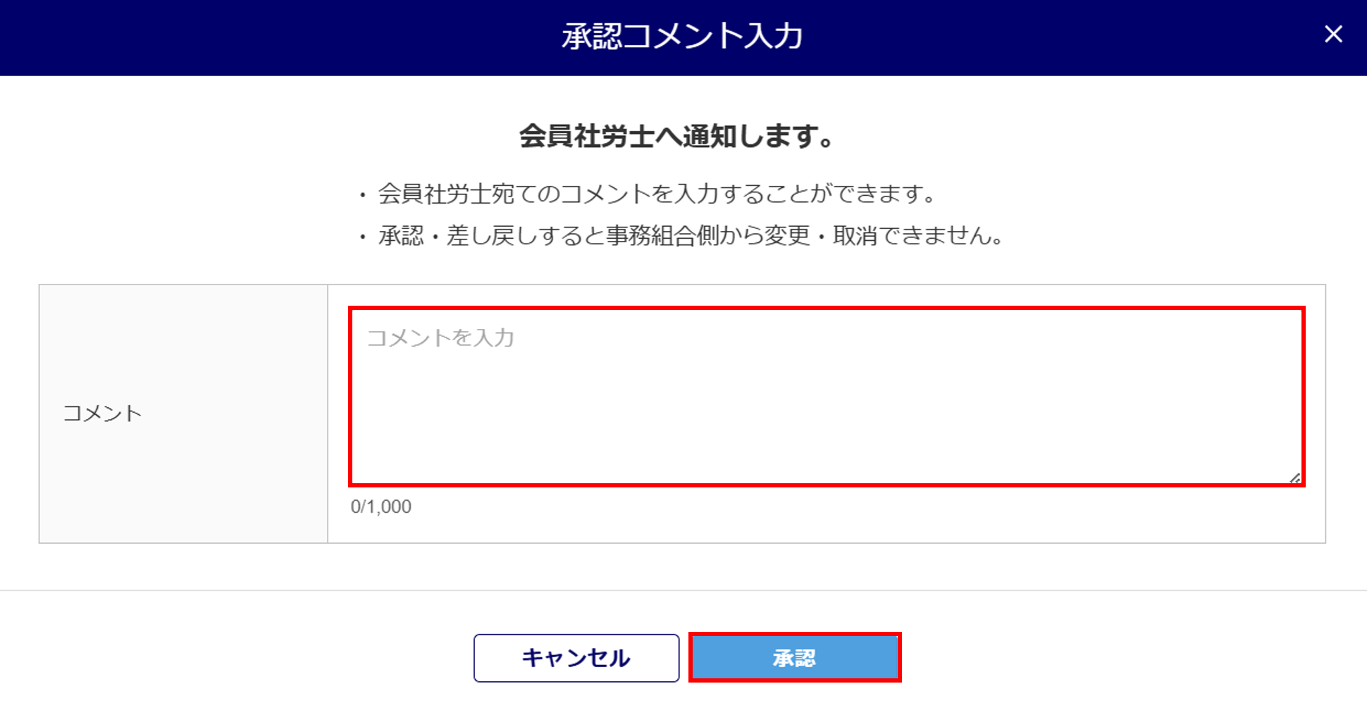 承認 クリックすると、会員社労士に対して承認コメントを入力し、承認できます。