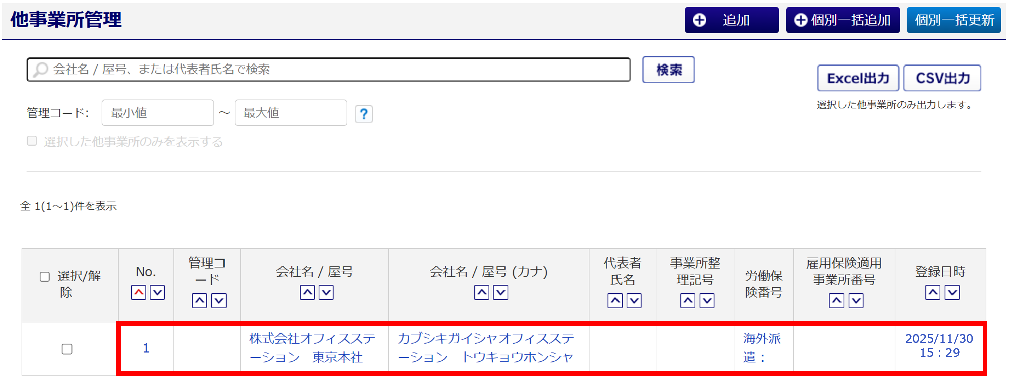 他事業所情報を個別に登録する場合、[追加]をクリックします。