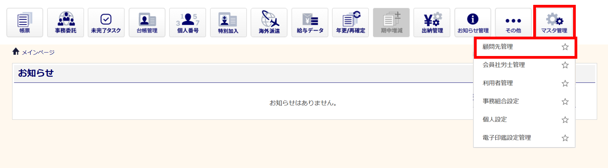 [マスタ管理]>[顧問先管理]をクリックします。